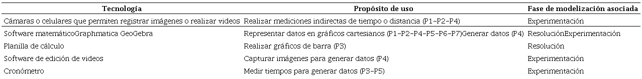 El Cuadro 2 sintetiza el empleo de distintas tecnologías para el desarrollo de los proyectos de modelización de naturaleza experimental que estamos analizando. La primera columna muestra las diferentes tecnologías elegidas y utilizadas por los estudiantes para el desarrollo de sus proyectos;la segunda enumeralos propósitos de uso y la tercera las fases del proceso de modelización relacionadas con esos propósitos. Utilizando el código asignado a cada proyecto, según consta en el Cuadro 1, en la segunda columna se especifica, entre paréntesis, en qué proyectos se puso de manifiesto cada propósito de uso.