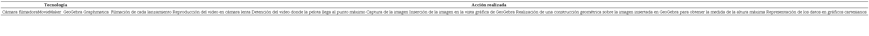 Este procedimiento se repitió para cada pelota (cuatro) y los ángulos elegidos (20°, 0°, 340° y 320°), de modo que se obtuvieron dieciséis mediciones. Es interesante notar cómo GeoGebra, siendo una herramienta relativamente nueva para estos estudiantes, ya usada en el estudio de propiedades de figuras geométricas, cambia su función a herramienta de medición indirecta ante la necesidad de medir las alturas alcanzadas por las pelotas. Por otra parte, los estudiantes ponen en evidencia el manejo hábil de las prestaciones de los distintos medios involucrados para realizar mediciones: Movie Maker permite ralentizar la filmación y obtener una imagen estática, y GeoGebra habilita la medición de distancias sobre la imagen (largo del hilo, altura alcanzada por la pelota etc.).