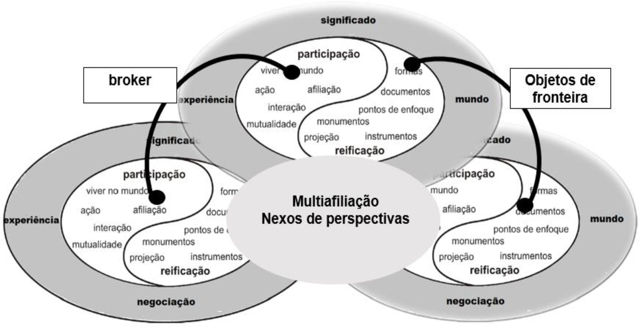 A Figura 1 evidencia o papel dos objetos de fronteira e o papel de intermediação, pelos brokers, no estabelecimento de relações entre comunidades, denotando o que Wenger (1998) denomina de constelação de práticas. Segundo o autor, o termo constelação é utilizado para denotar um sistema cujos objetos que o constituem podem não ter a mesma forma, tamanho ou não ser tão próximos geograficamente, mas que estão interconectados e cuja visão de conexão depende da perspectiva de quem olha.