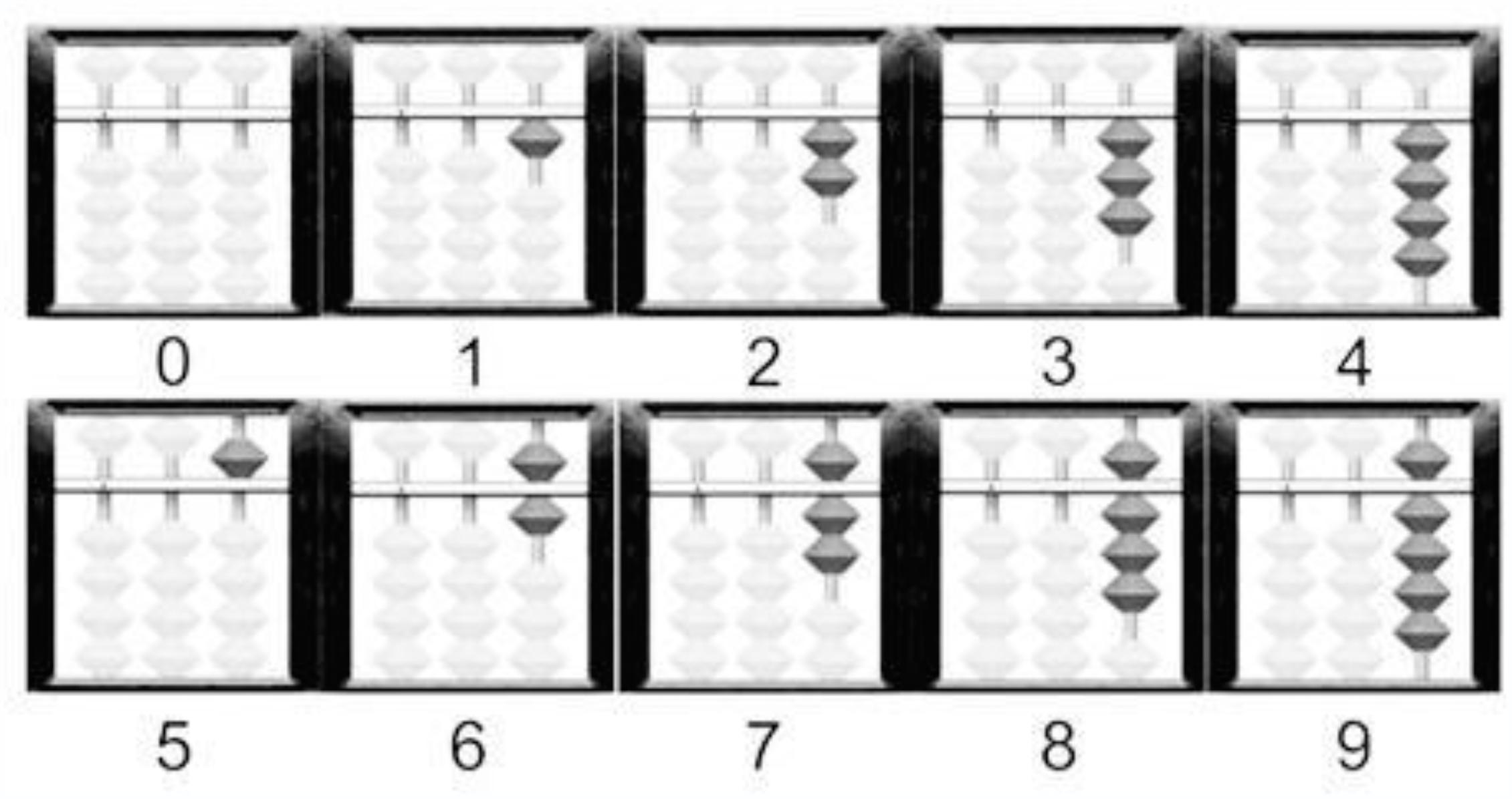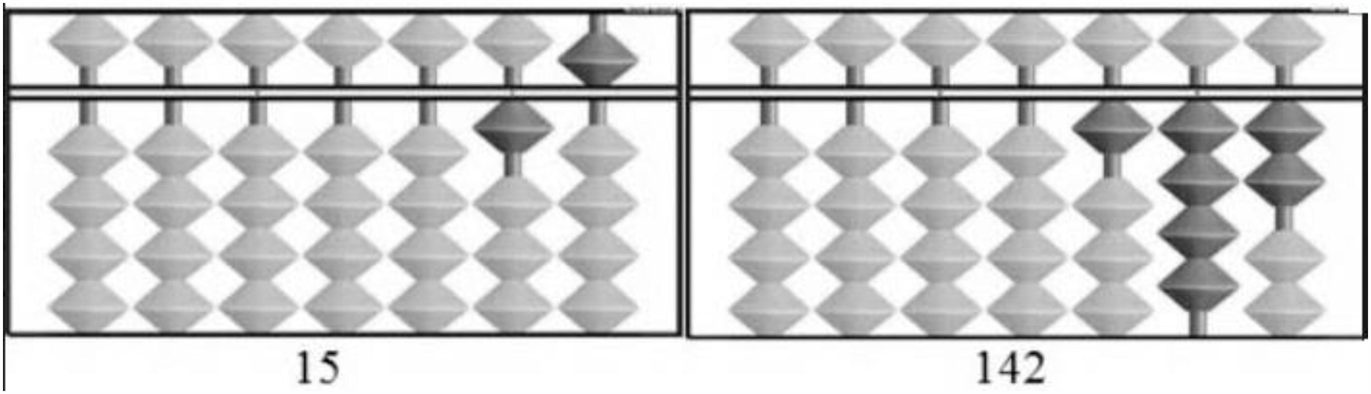 To record a number on the soroban, it is necessary to place beads near the reckoning bar. Figure 2 illustrates representation of digits 0 to 9 and Figure 3 illustrates the record of numbers 15 and 143: