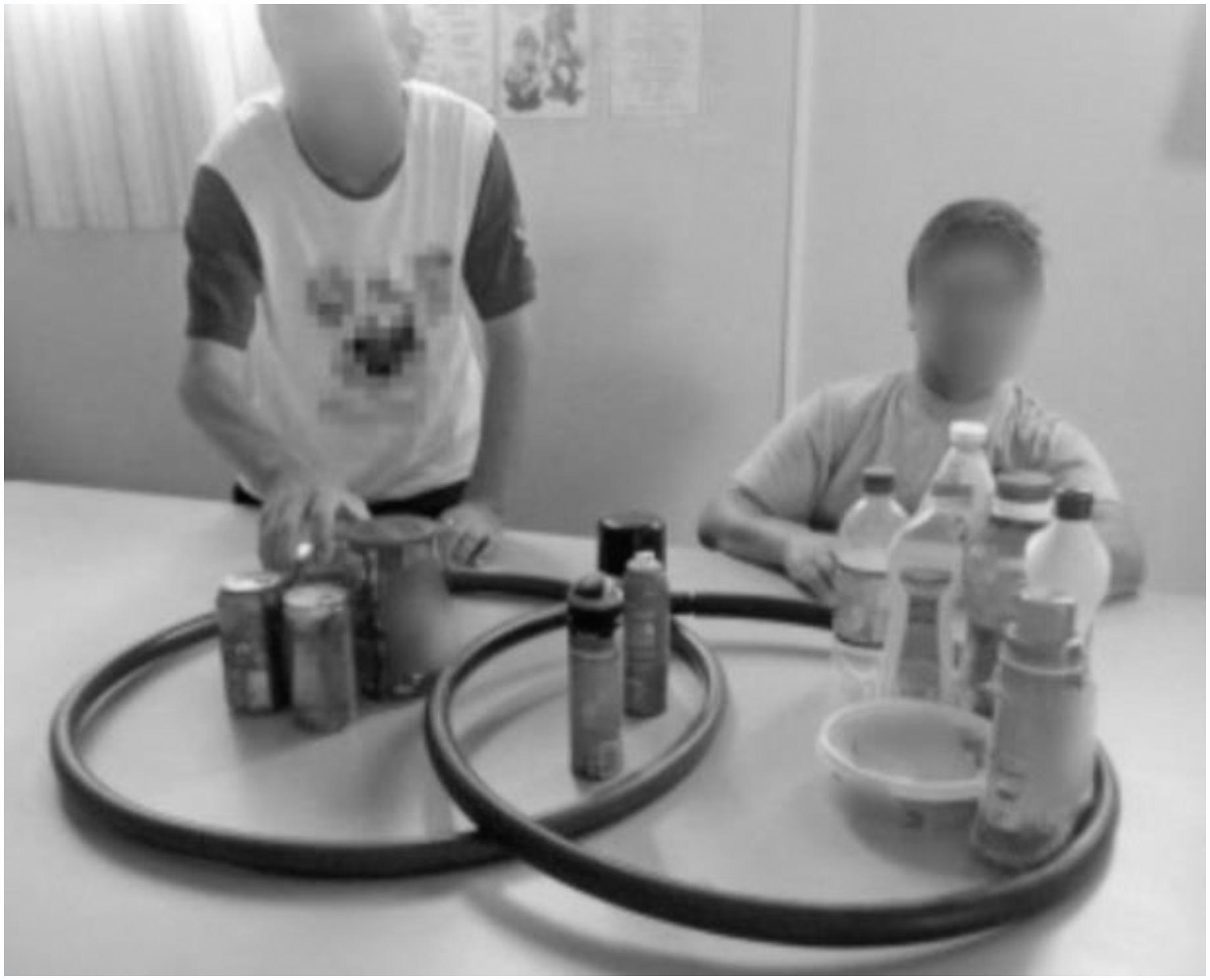 Another activity developed with the packages was the sorting of objects using hula hoops, which represented the Venn diagram, used in mathematical language to represent, and perform operations between sets (SOUZA, 2019). In one of the hula hoops there were metal packages and, in the other, plastic packages. When the hula hoops were intersected, metal and plastic packages should be placed at the intersection. The students were able to identify common characteristics between the packages, not the differences. For example, they could not see a plastic cover in a metal package. The researcher's intervention was necessary, requesting their observation explaining the types of materials present in each package. For Vigotski (2001), the first step towards the abstraction of a concept happens when the student is able to group a maximum possible number of objects using two or more attributes as the basis, as in the given example of package classification through the Venn diagram. Figure 4 shows this activity: