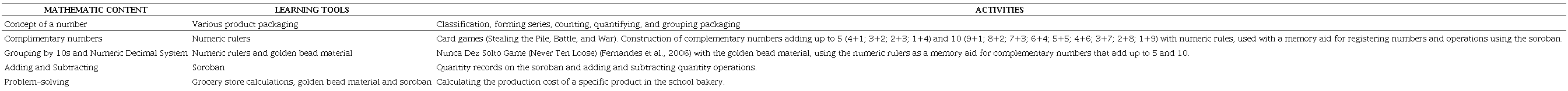 A mathematics curriculum designed for EJA students attending Elementary School focusing on SE was used to introduce the soroban as a calculation tool (PARANÁ, 2014). The curriculum was comprised of operations such as sorting numbers, series, counting, quantifying, the decimal number system, addition, subtraction, and problem-solving.
