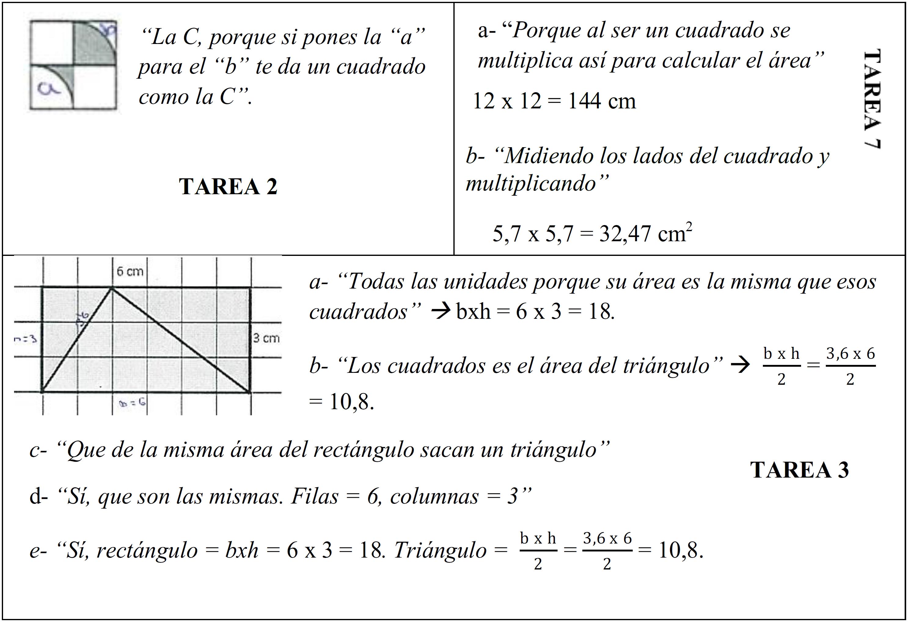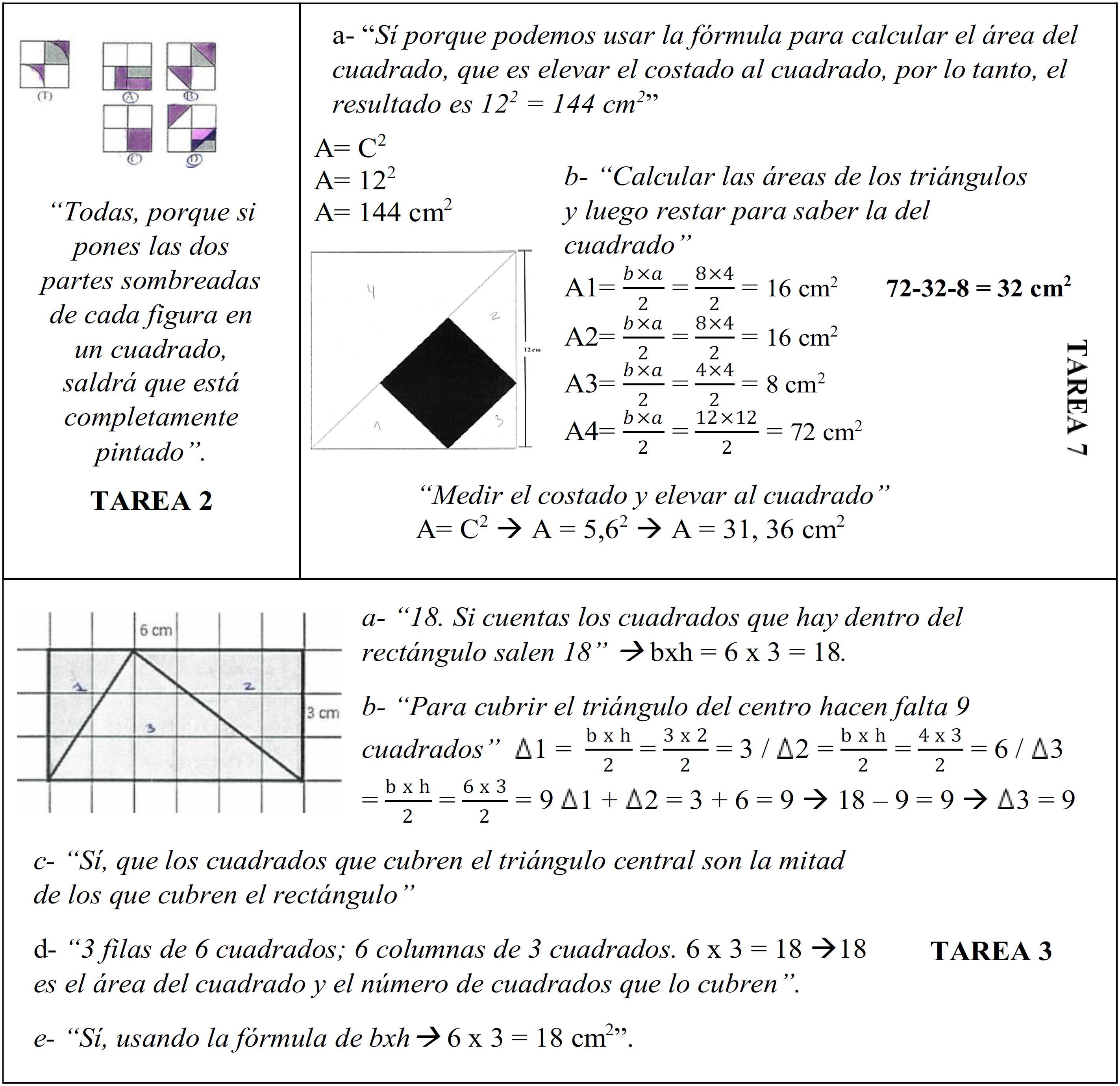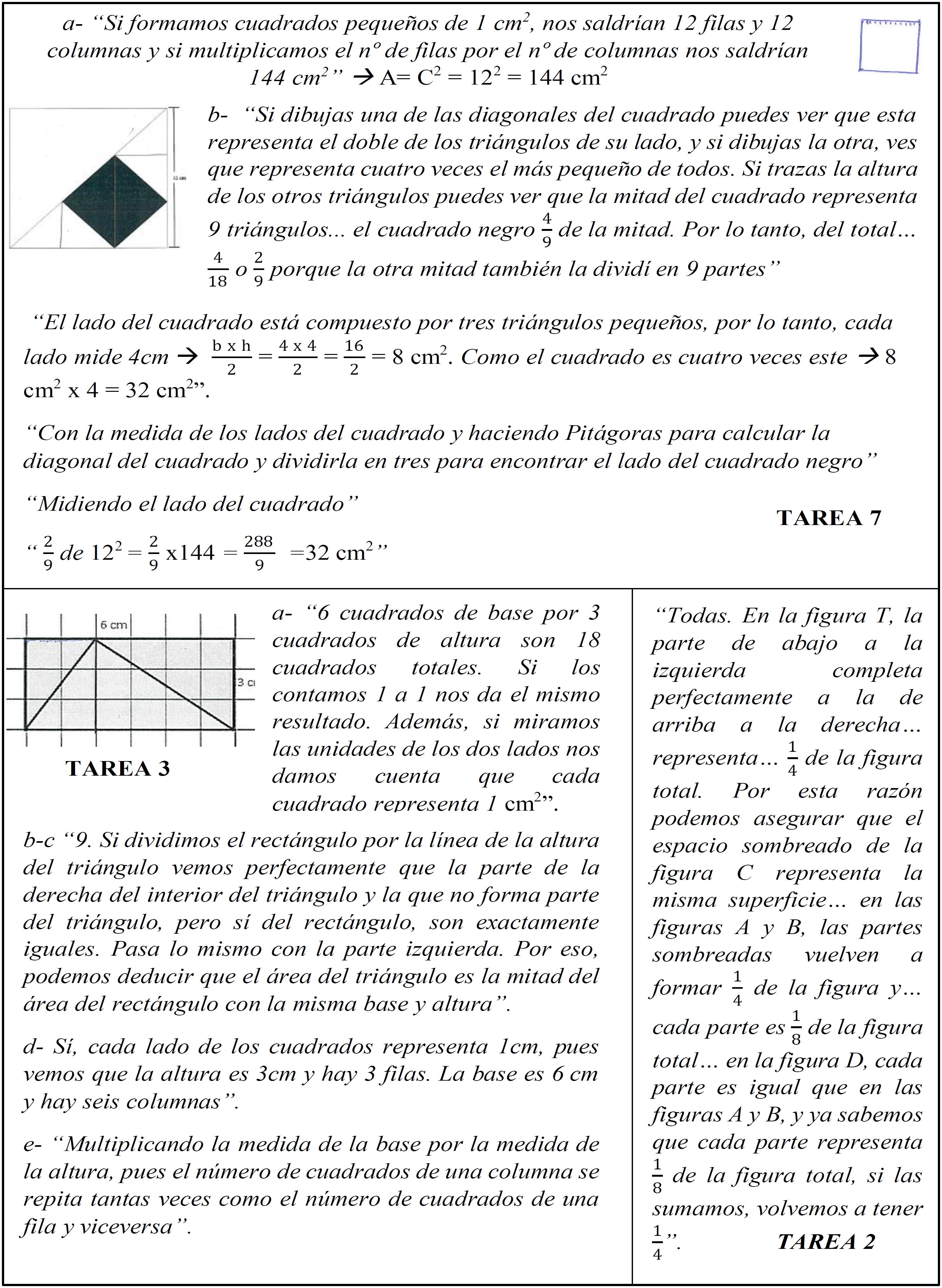 Se observa un uso adecuado de los SP2 y SP4. Por ejemplo, en la Tarea 7 (Figura 3) se descompone el cuadrado negro y se obtiene el área por medio de la suma del área de los triángulos que lo componen (acumulación y aditividad). En la Tarea 2 (Figura 3), con base en estimaciones visuales, se concluye que tres de las figuras poseen un área equivalente, pero no se advierte que todas las figuras poseen área equivalente (conservación del área). Por último, en la Tarea 3 (Figura 3) se establece una correcta relación, por influencia de valores numéricos, entre las áreas de rectángulos y triángulos. Se menciona, erróneamente, que cada cm es una unidad cuadrada, pero no se dice que las medidas de longitud del rectángulo y del triángulo del centro están dadas por la estructura de filas y columnas del rectángulo.