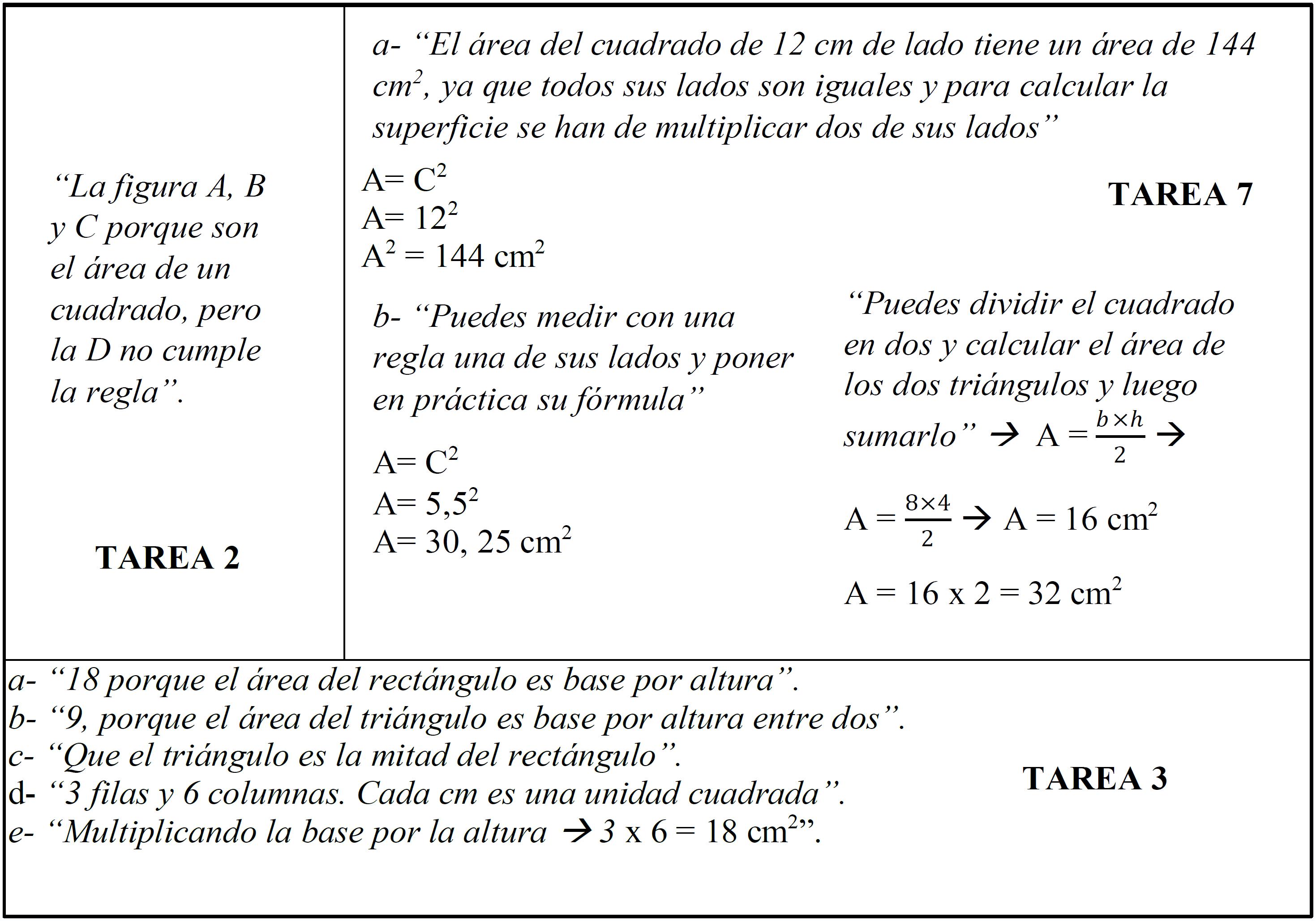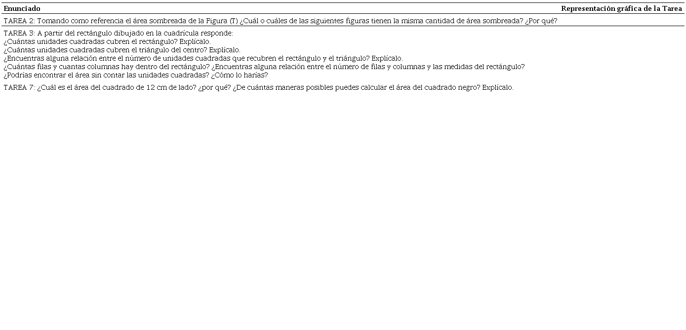 La Tarea 2 permite buscar evidencias de la capacidad de los estudiantes para resolver tareas que admiten aproximaciones geométricas del área. Las tareas 3 y 7 permiten buscar evidencias de la capacidad de los estudiantes para resolver tareas que admiten aproximaciones geométricas, numéricas y/o algebraicas del área, ya que, permiten el uso de diferentes SP del área. De esta manera, la consideración de estas tres tareas permite mostrar evidencias de los SP del área que ponen en práctica los estudiantes a lo largo del cuestionario y, permite mostrar evidencias de transformaciones de tratamiento y conversión.