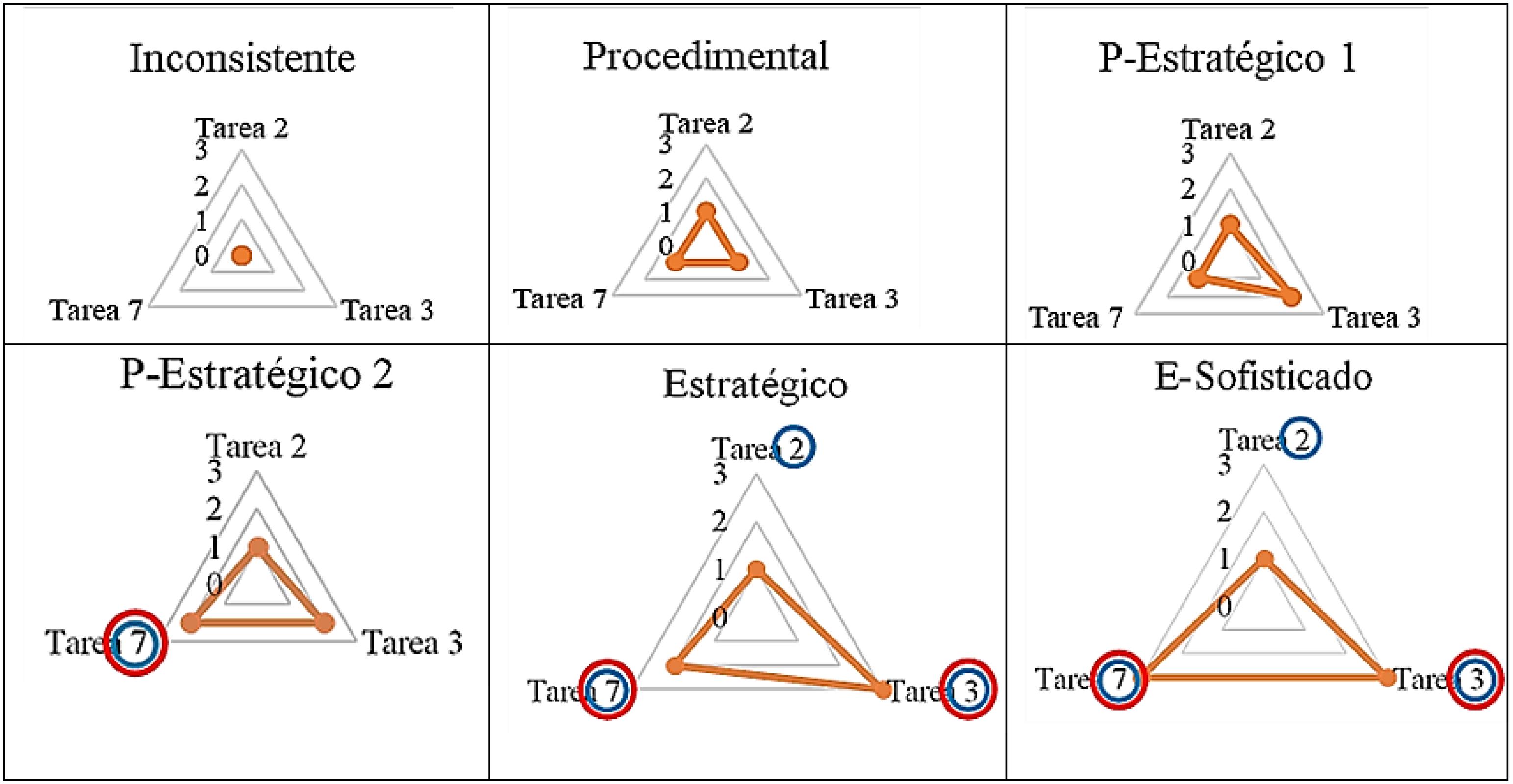 En la Figura 6 es posible observar el número de SP del área que ponen en práctica los estudiantes en cada tarea. Los valores ubicados en el centro corresponden al número de SP del área que son utilizados en cada tarea. El valor mínimo es cero, pues el perfil inconsistente no evidencia uso coherente de los SP del área. El valor máximo es 3 debido a que el perfil más avanzado utiliza los SP2, SP3 y SP4 del área. Esto se debe, principalmente, a que el SP1 considera procedimientos con ausencia de razonamiento numérico; es decir, se utilizan expresiones como: más grande, más pequeño, menos, más, entre otros. Pero los estudiantes, debido a su instrucción previa posiblemente, tienen incorporado el razonamiento numérico. El círculo rojo indica la presencia de conversiones y el circulo azul, de tratamientos.