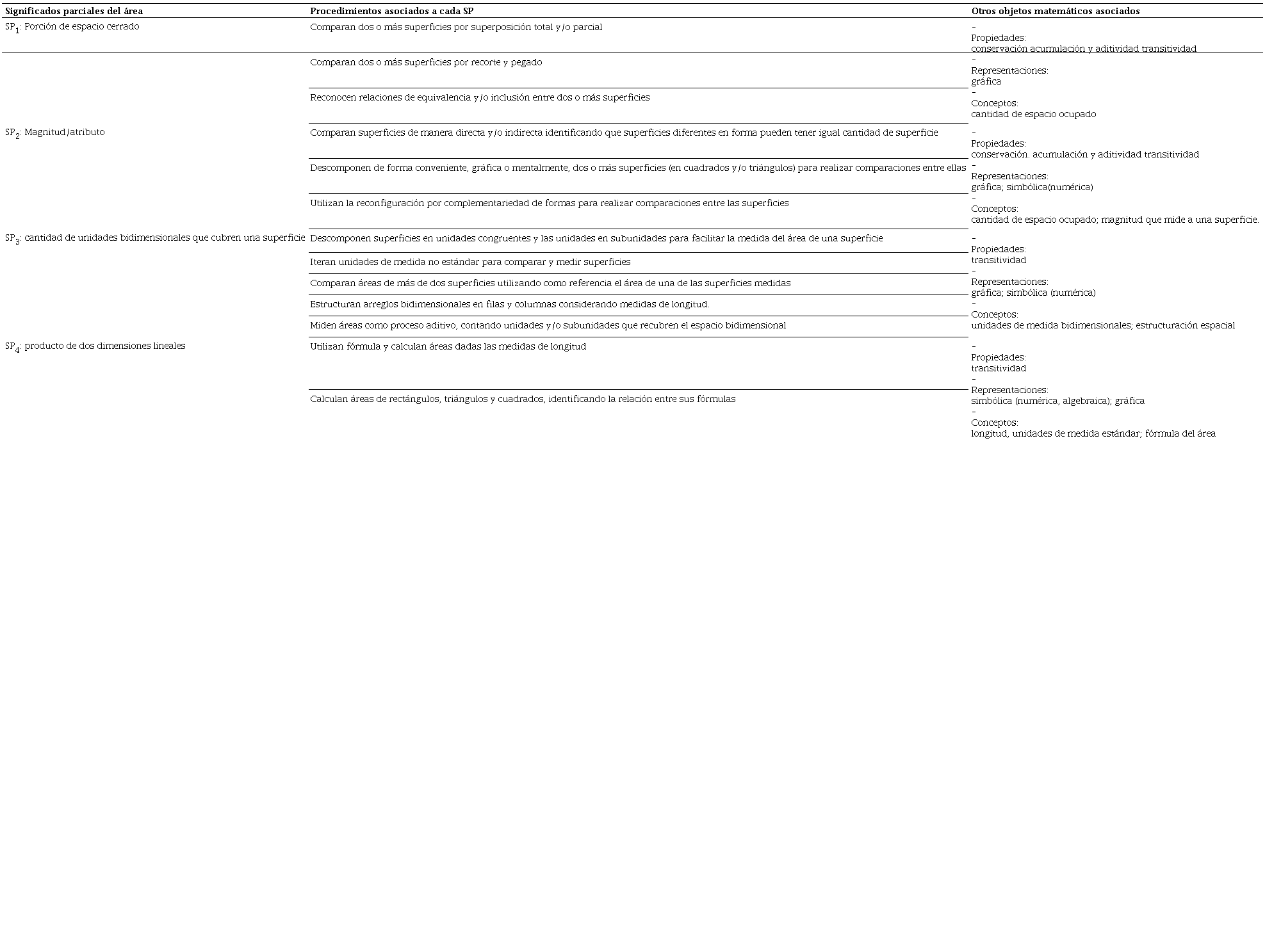 En una primera etapa, la complejidad de los objetos matemáticos propuesta por el EOS permite organizar la revisión bibliográfica (CORBERÁN, 1996; FREUDENTHAL, 1983; SARAMA; CLEMENTS, 2009) en subsistemas de prácticas de los que emergen, a modo de categorías, SP del área que se caracterizan de manera explícita mediante la configuración de objetos primarios. Se identifican cuatro SP del área, que van desde un enfoque geométrico, es decir, manipulación de objetos concretos mediante transformaciones rígidas, hacia un enfoque numérico y algebraico. En el Cuadro 1 se presentan, de manera sintetizada, los cuatro SP del área. Se hace énfasis en los procedimientos, ya que permiten buscar evidencias de propiedades, representaciones y conceptos de los diferentes SP, además de transformaciones de tratamiento y conversión.