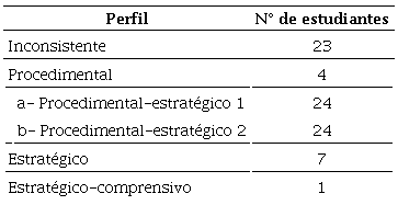 Una vez codificadas las respuestas, se identifican patrones de resolución de los estudiantes a las tareas presentadas. Para ello se consideran los SP del área más utilizados, además de las transformaciones de tratamiento y conversión. La interpretación de las respuestas de los estudiantes permite diferenciar 6 tipos de perfiles de estudiantes.