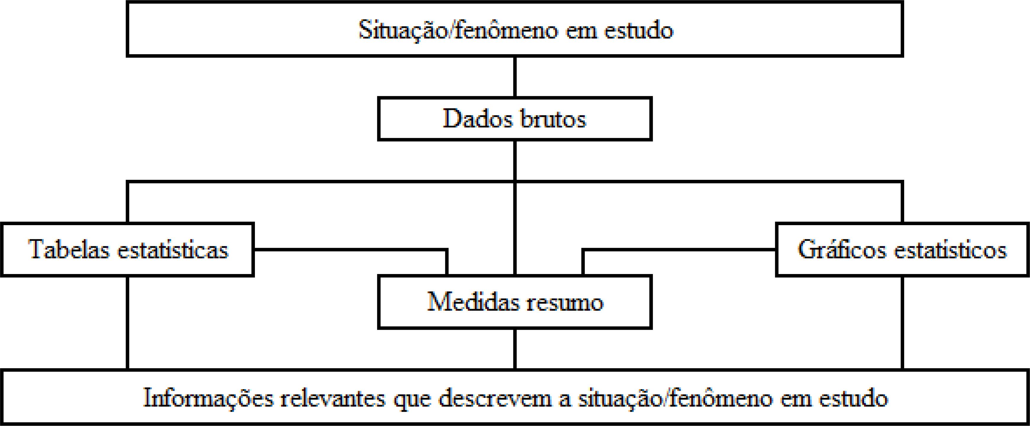 Neste trabalho, assumimos Estatística como um campo de conhecimento que tem como fim desenvolver ferramentas para transformar em tabelas, gráficos e medidas resumo os dados brutos, obtidos de uma situação ou de um fenômeno em estudo, para extrair informações relevantes, padrões, regularidades e relações entre as variáveis, visando sua descrição e compreensão, conforme Figura 1.