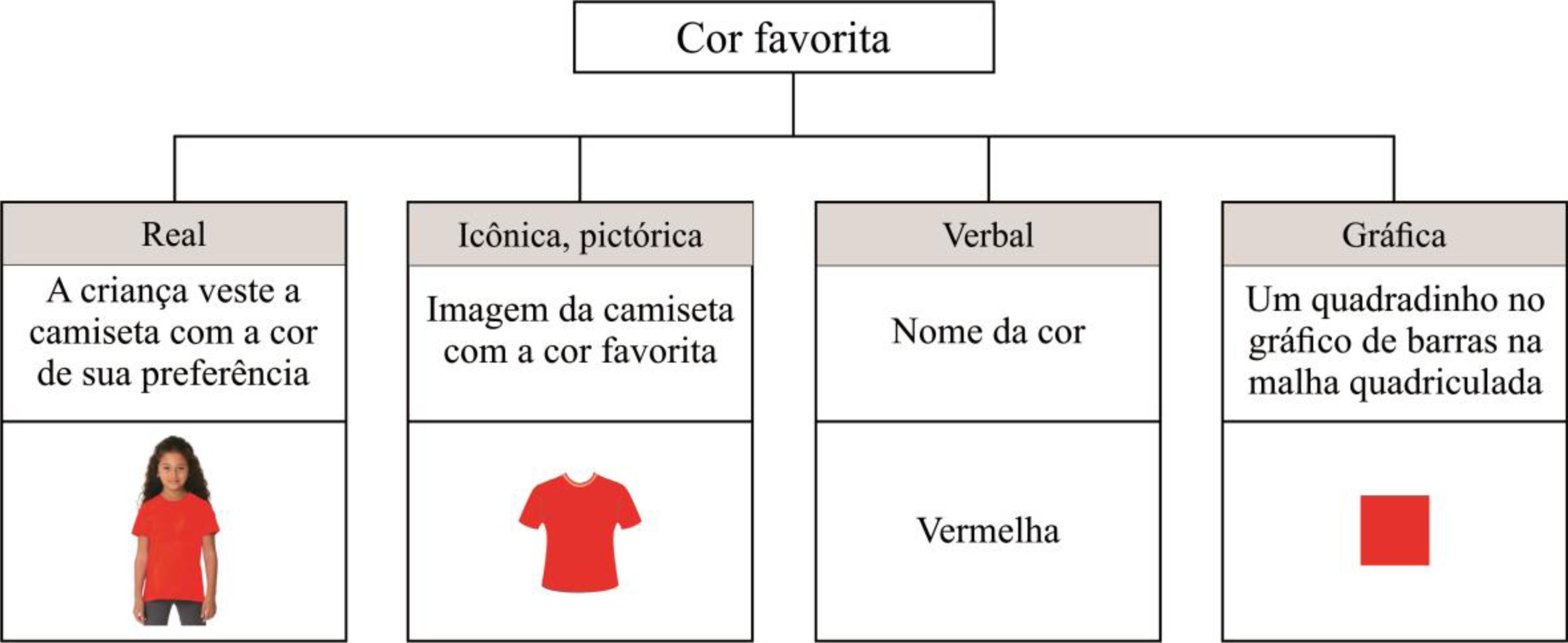 A título de ilustração, podemos ver, na Figura 3, as diversas representações dos dados da variável “cor favorita da turma”. A primeira representação, que denominamos “real”, ocorre quando uma criança veste uma camisa de sua cor favorita. A segunda, designada “icônica” ou “pictórica”, revela-se quando utilizamos figuras ou ostensivos que representem a cor – neste caso, figura de camisa colorida. Podemos também representar verbalmente, escrevendo o nome da cor da camisa, neste caso “vermelha”, e gráfica, quando consideramos um quadradinho que compõe o gráfico de barras em uma malha quadriculada.