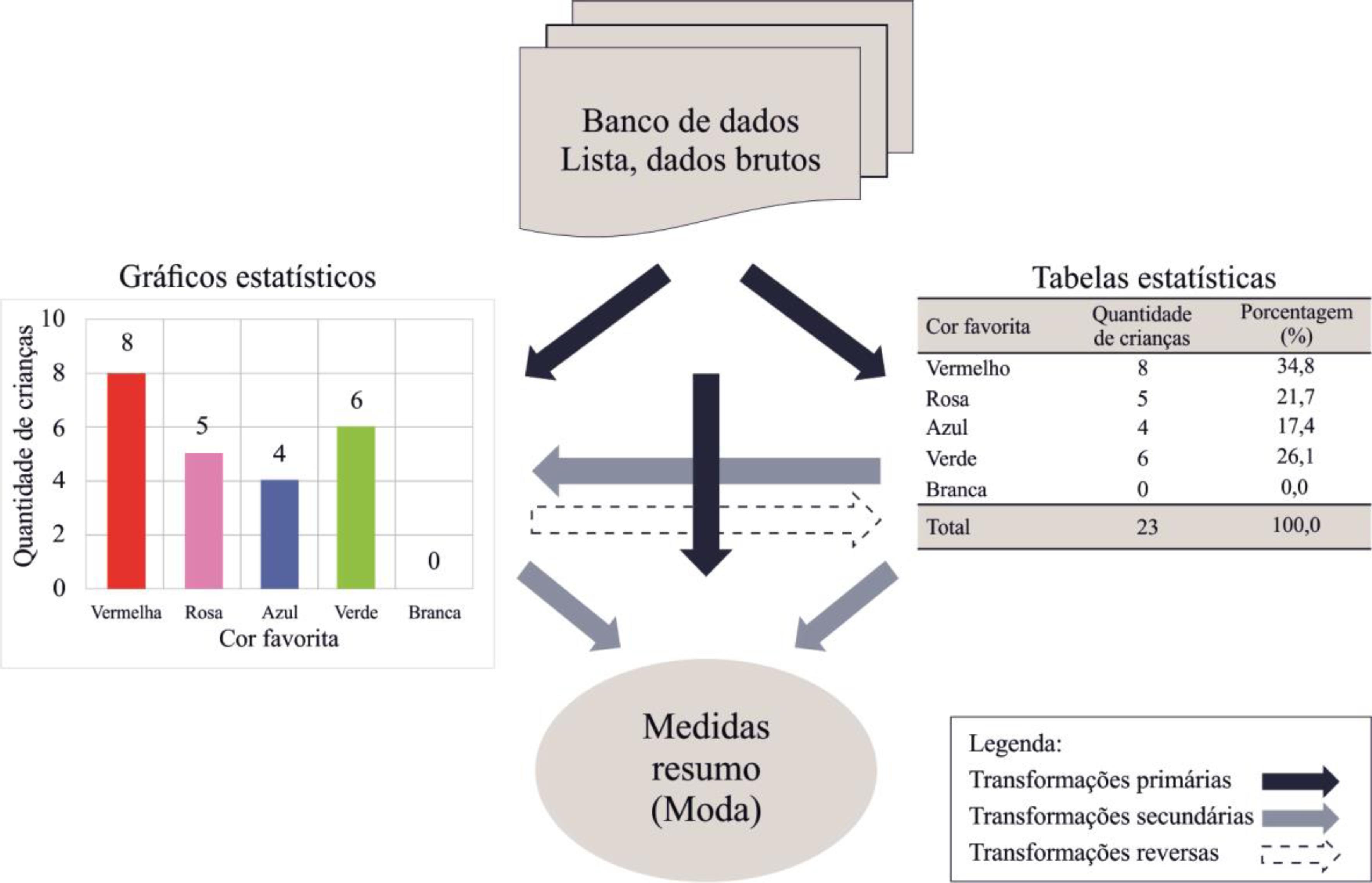 Em termos de medidas de tendência central, temos a moda, que é a cor que foi mais escolhida pelas crianças – neste caso, a cor vermelha, com 34,8% da preferência. Para comunicar os resultados, podemos escolher a TDF, o gráfico de barras ou, ainda, o gráfico circular como objetos não ostensivos.