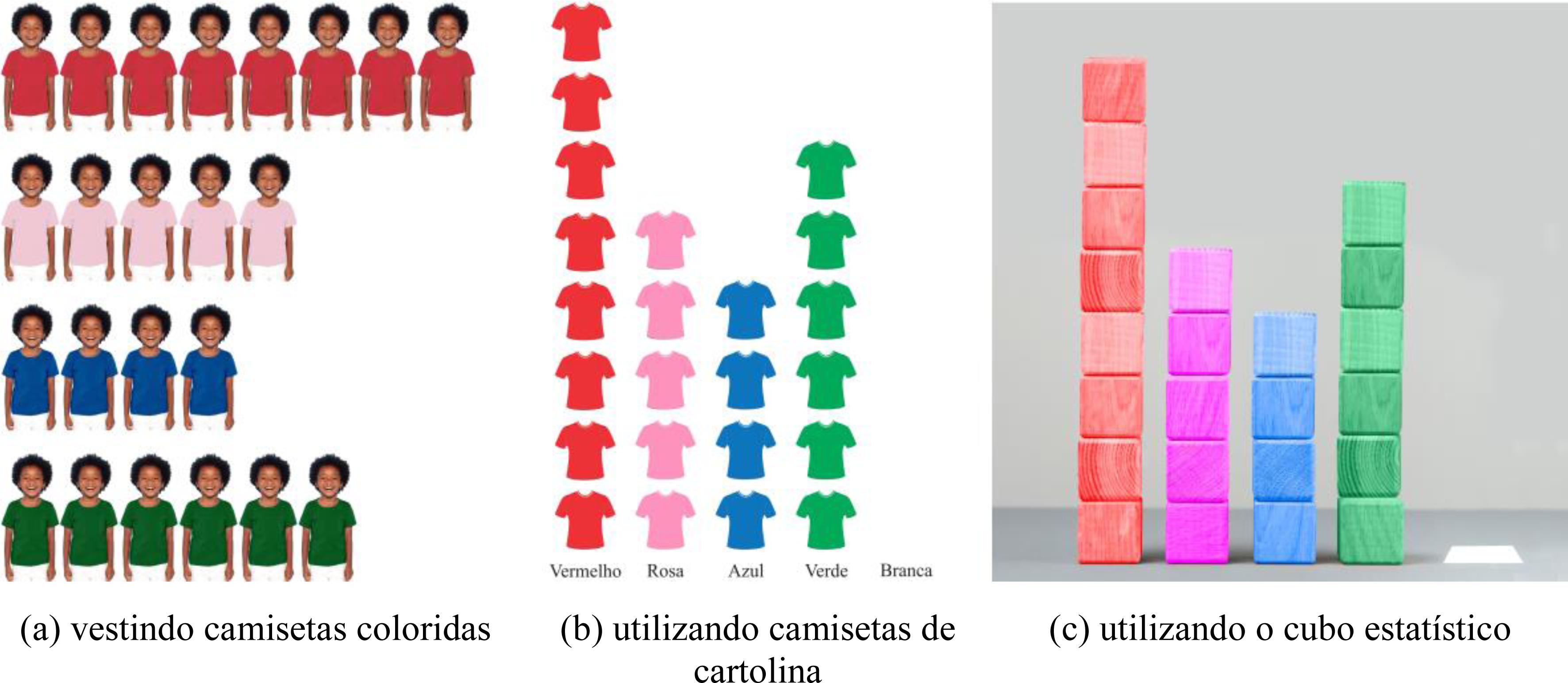 Suponhamos que desejemos conhecer a “Cor favorita da turma”, em uma situação de ensino com crianças nos Anos Iniciais do Ensino Fundamental ou da Educação Infantil. A variável “Cor favorita” é qualitativa nominal, cujo tratamento estatístico pode passar pela mobilização de objetos ostensivos, uma vez que as crianças podem vivenciar a transformação dos dados, como, por exemplo, vestindo uma camiseta da cor favorita (Figura 3a).