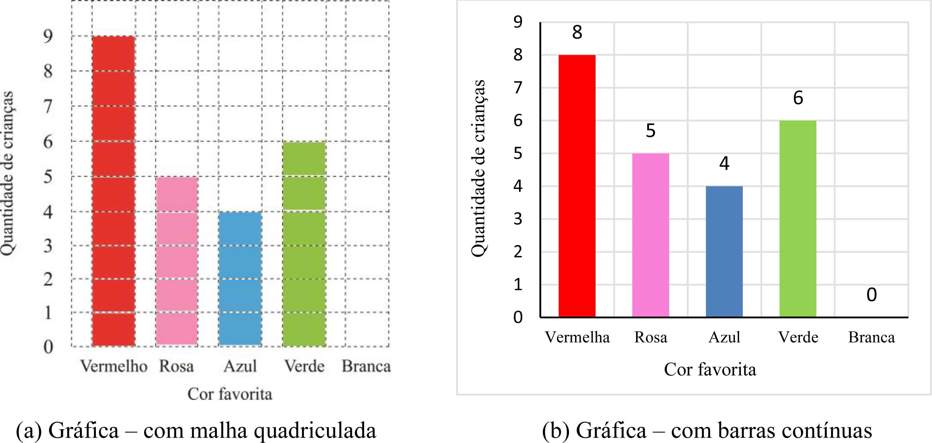 A seguir podemos representar esses dados em gráfico de barras, pintando quadradinhos com a cor favorita, na malha quadriculada (Figura 6a), e depois pintando as barras contínuas, com a altura igual à quantidade de crianças que escolheram cada cor (Figura 6b). Neste caso particular, a cor das barras ainda é elemento ostensivo, mas os outros elementos são não ostensivos.