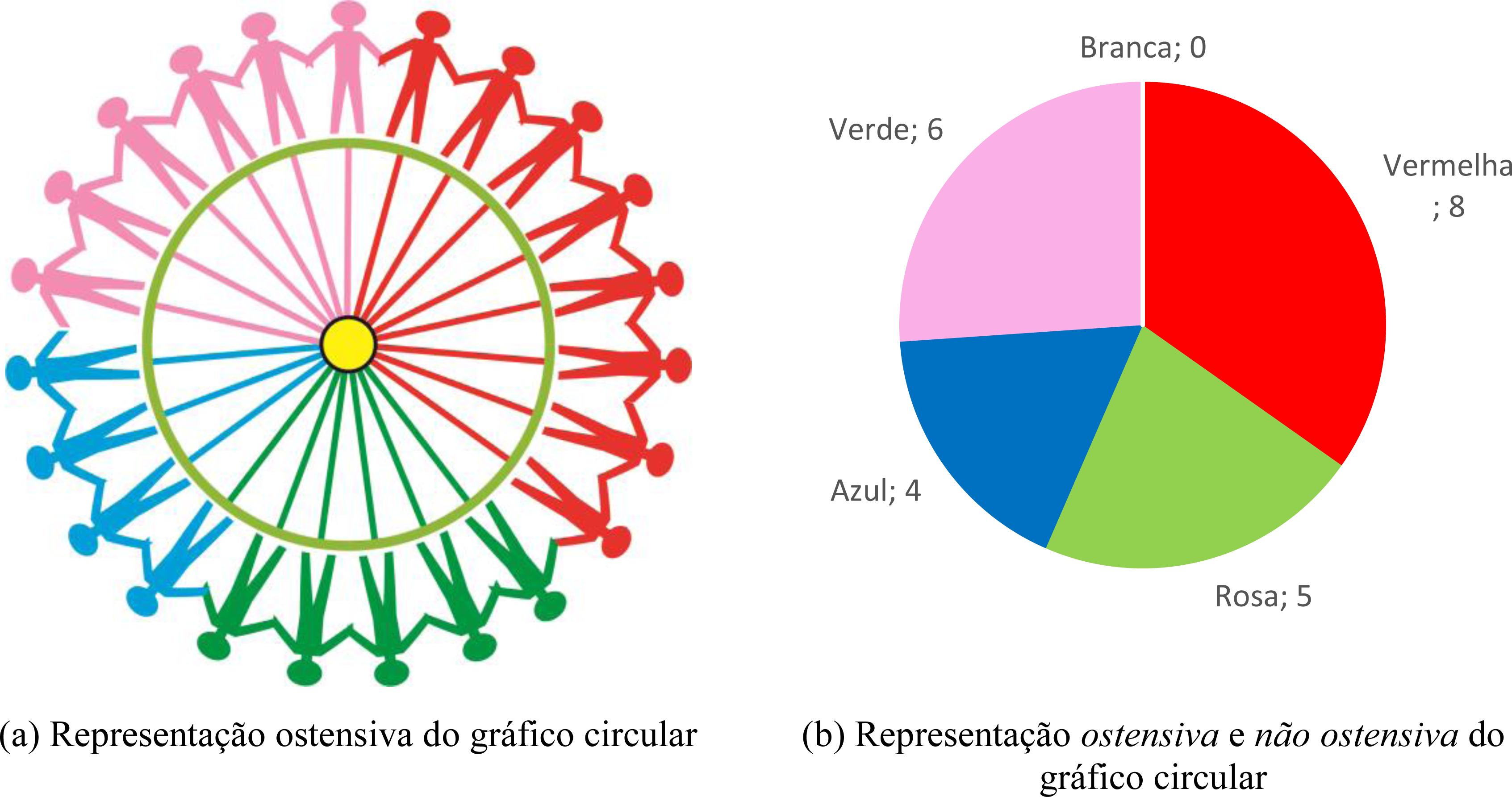Ainda, na utilização de ostensivos podemos solicitar às crianças que formem um círculo, de acordo com a cor das camisas, e dar, a cada uma delas, fitas coloridas correspondentes, para fazer a ligação entre elas e o(a) Professor(a) que está no centro do círculo (Figura 7a) e, posteriormente, construirmos o gráfico de setores, mobilizando os objetos ostensivos como círculo decomposto em setores; as diferentes cores notáveis sobre os setores e os objetos não ostensivo s associados, tais como a noção entre parte e todo, a porcentagem, a noção de setores (ângulo) de um círculo e a noção de gráfico circular (Figura 7b).