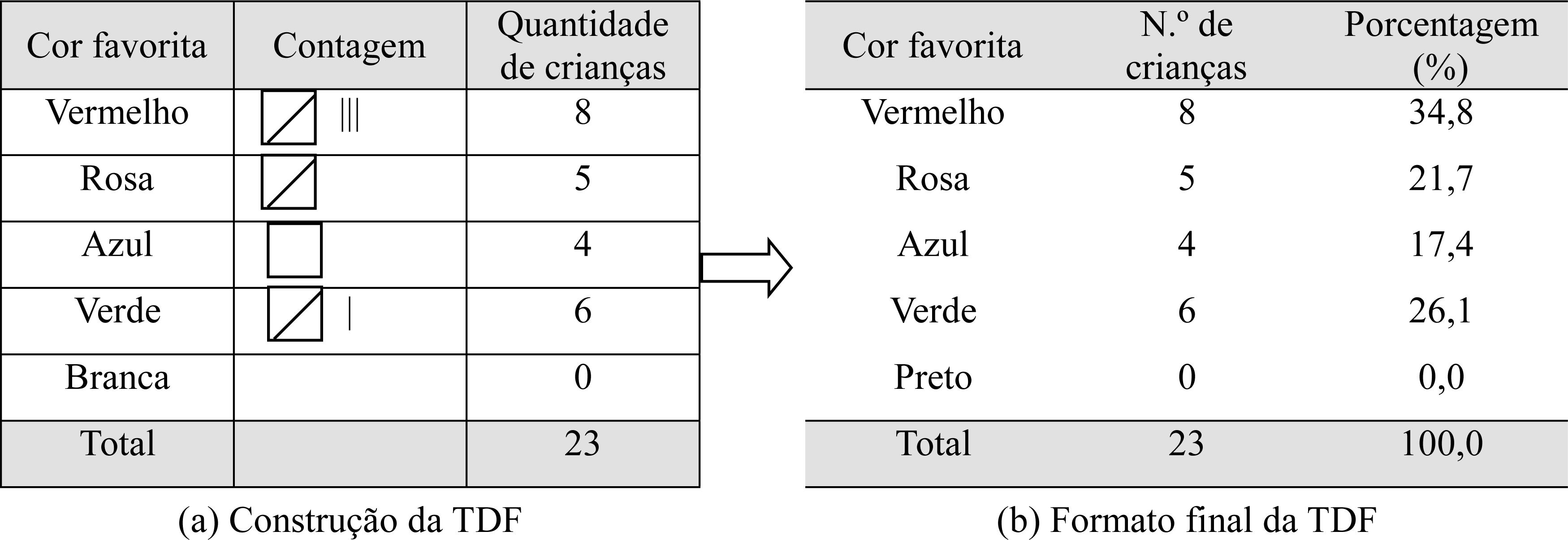 Por fim, passamos para a representação numérica. Para isso construímos uma TDF, que é uma tabela composta pelas categorias da variável, neste caso, “cor favorita” que tem cinco categorias: Vermelho, Rosa, Azul, Verde e Branca, acompanhadas da contagem e da representação numérica da quantidade de crianças que escolheram cada cor, isto é, a “frequência absoluta”, conforme Figura 8a.