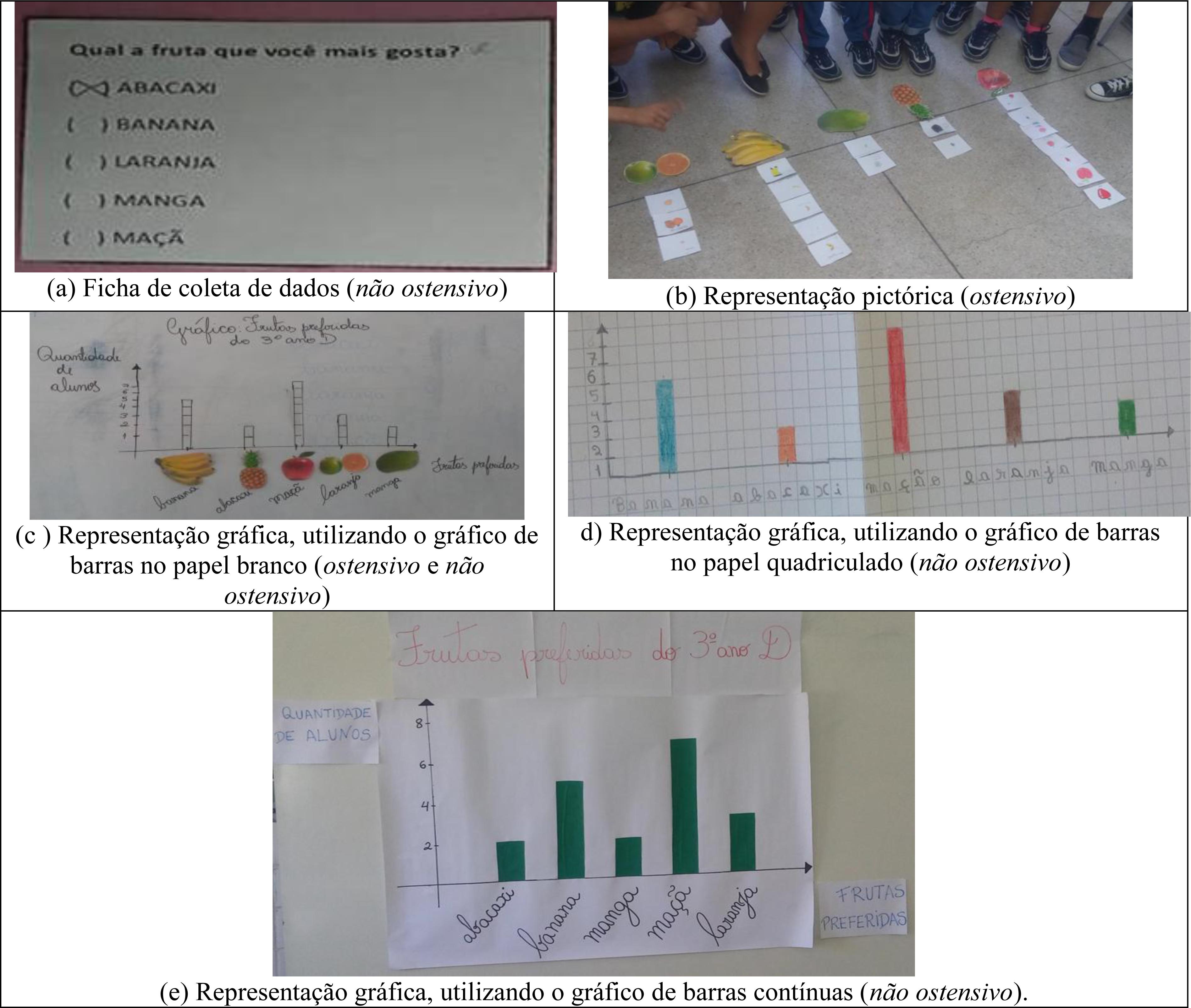 Arruda (2017) realizou uma intervenção com estudantes do 3° ano e trabalhou a variável “Fruta preferida da turma”, entregando uma ficha para marcar (Figura 9a). Em seguida solicitou aos estudantes que, em um pedaço padronizado de papel, desenhassem a fruta escolhida, construindo o pictograma no chão (Figura 9b); depois construíram o gráfico de barras no papel branco (sem marcações), desenhando a barra com as marcas de cada quadradinho (Figura 9c); em seguida, desenharam no papel quadriculado, que tem marcações para cada quadradinho (Figura 9d); e, finalmente, construíram o gráfico de barras na cartolina, utilizando faixas contínuas, como ilustrado na Figura 9e.