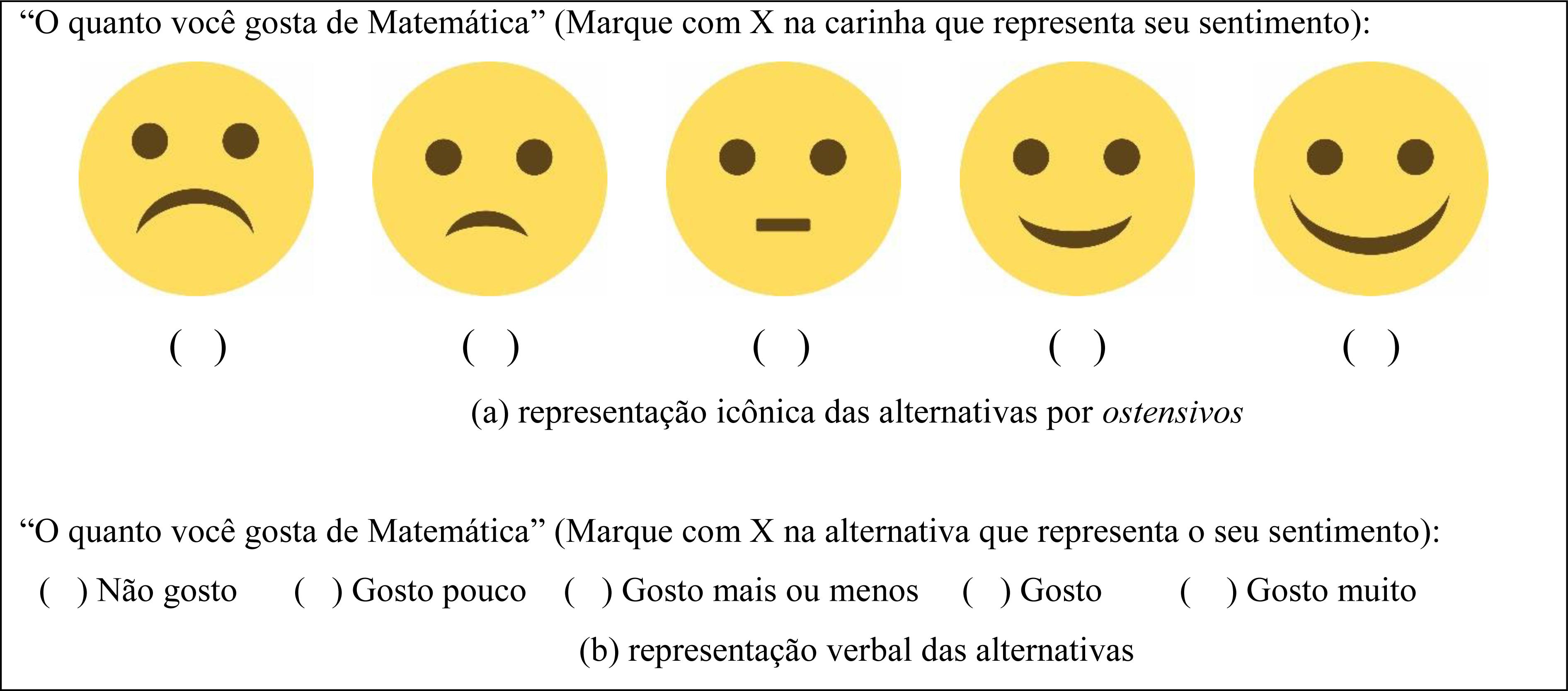Quando trabalhamos com variáveis conceituais, precisamos construir instrumentos que sejam capazes de traduzir esses sentimentos em categorias ou escalas que nos permitam a sua “mensuração” ou apreensão. Por exemplo, podemos trabalhar com os estudantes a variável: “Gosto pela Matemática”, utilizando carinhas que representam as categorias, conforme mostrado na Figura 10.