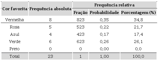 Na Tabela 1 aproveitamos para expor os diversos tratamentos que a frequência absoluta sofre para ser expressa em números relativos (parte/todo), que podem ser apresentados utilizando frações, números decimais (probabilidade) e porcentagem.