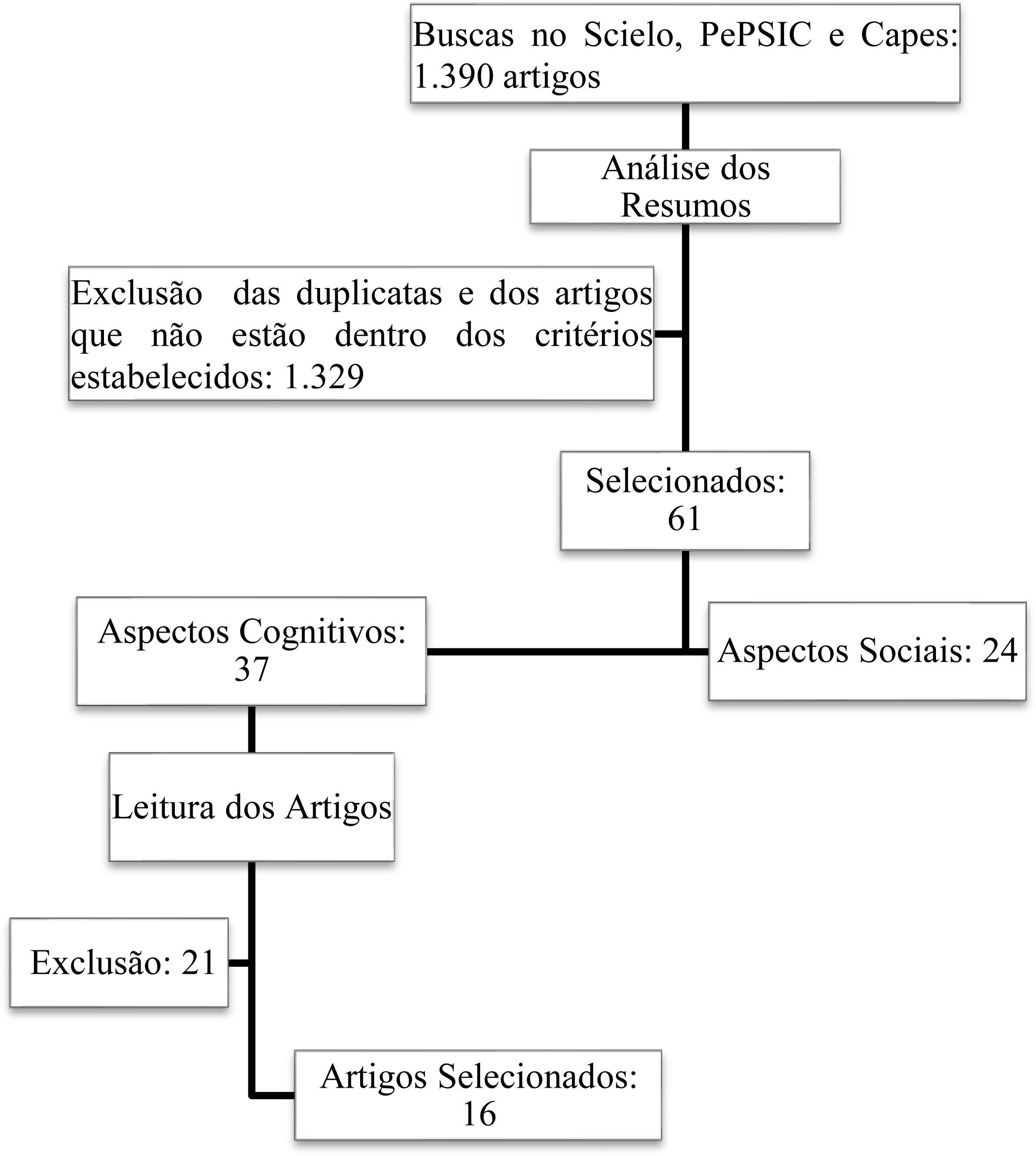 A conjugação dos descritores nas buscas resultou na identificação de 1.391 artigos, conforme indicado na Figura 1. Após a análise dos títulos e resumos, foram excluídos os trabalhos duplicados e os que não se enquadravam nos critérios estabelecidos. Destacaram-se 61 trabalhos, dos quais 24 investigaram a interferência de aspectos sociais na aprendizagem da Matemática, 37 relacionavam a aprendizagem da Matemática com aspectos cognitivos, e havia indícios de que estavam dentro dos critérios estabelecidos. Os autores desta pesquisa realizaram a leitura completa dos artigos.