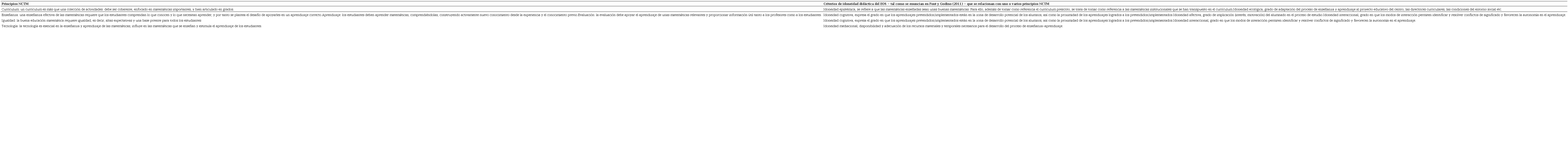 De acuerdo con la decisión 4 expuesta en el apartado 4, se trata de un constructo multidimensional que se tiene que descomponer en idoneidades parciales, componentes e indicadores (GODINO, 2013). Para avanzar en esta dirección, de acuerdo con la decisión 3 expuesta en el apartado 4, en el EOS se consideró que, dado el amplio consenso que generan, los principios del NCTM, reinterpretados, podían ser el origen de algunos de los criterios de idoneidad didáctica, o bien podían contemplarse como componentes suyos. En concreto, se reinterpretaron los principios del NCTM como se explica a continuación.