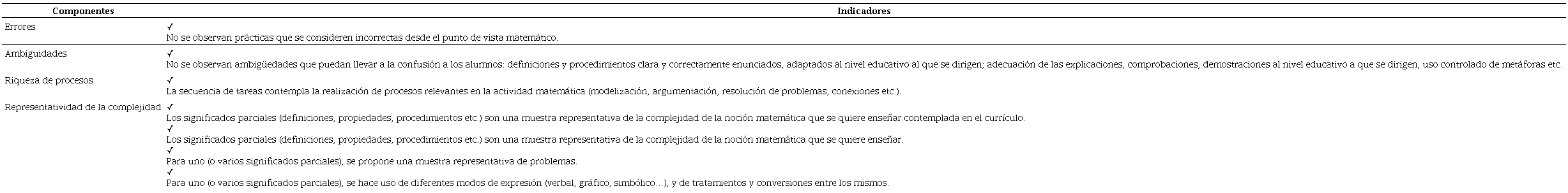 Entendido de esta manera, dicho indicador es un criterio específico de idoneidad epistémica. En cambio, los componentes tienen un papel clasificatorio de indicadores, por ejemplo, el componente representatividad de la complejidad es un conjunto de indicadores (los cuales se pueden entender como criterios específicos de idoneidad epistémica) que, globalmente, permiten conseguir el objetivo de que en el proceso de instrucción de un determinado objeto matemático se tenga en cuenta su complejidad.