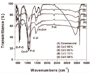 Figure 3 shows the spectra of samples M5 to M8 corresponding to the hydroxyapatite obtained with different percentages of CaO, with particle size of 74 μm, heating ramp of 15°C/ min, under a sintering temperature of 1060°C and 7 hours. Additionally, it is presented a spectrum of commercial nano-hydroxyapatite in which the band around 1080 cm -1 associated to the transition corresponding to the O-P-O bonds HA flexion type ( v 4) (Siriphannon et al ., 2002) are mainly identified. Analyzing Figure 3, it is very clear the presence of an active mode of vibration around 571 cm -1 and 601 cm -1 corresponding to the O-P-O bonds of HA flexion type ( v 4) (Siriphannon et al ., 2002). The vibration centered in the band of 3670 cm -1 corresponds to the OH- bonds of stretching type (Pramanik et al. , 2005).