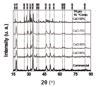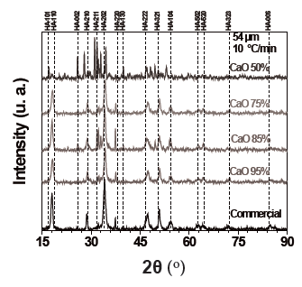 A characterization through X ray diffraction for the commercial HA (Ca 10 (PO 4 ) 6 (OH) 2 ) was conducted to determine its structural nature. It is compared to the X-ray diffractograms obtained for the samples synthesized from solid residues of eggshells. International patterns of indexation taken from the JCPDF 01-074-0565 database obtained from the “ Inorganic crystal structure database ” (ICSD) were considered for the X-ray diffraction analysis. Figure 5 shows the X-ray diffractograms obtained for the samples that are between M1 and M4 with different percentages of CaO, with particle size of 54 μm, heating ramp of 10°C/min, under a sintering temperature of 1060°C and 7 hours of treatment.