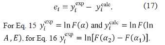 (16)In fact, a similar function was proposed by Cai and Chen for an iterative linear integral isoconversional method (Cai & Chen, 2012). These forms are convenient because the preexponential factor A usually has very high values, therefore the use of ln A prevents the mixture of terms with very different orders of magnitude in the same expression. Then, residuals are defined as the differences between the left-hand and right-hand sides of these equations, i.e.