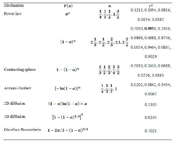 Mechanism functions tested for NNHT data with the Popescu method (Jiao-Qiang et al., 2009; Popescu, 1996; Sbirrazzuoli, 2013; Vyazovkin et al., 2011). r2 is the coefficient of determination obtained for each mechanism, its values ar e in the same order given for n.