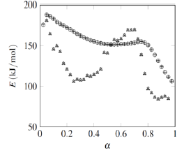 The isoconversional analysis was applied to T sets corresponding to the four heating rates for each α , therefore the results are presented in Figs. 2 and 3 as functions of α in both variants, (Eqs. 15 and 16). The function S r depends on two variables ( E , ln A ), and it was minimized using the Nelder-Mead algorithm, as included in the software Scilab. The initial estimates of E , ln A were 100 kJ/mol and 20 (similar to the results in the source of experimental data), and for each following α the minimization was started with the results from the previous extent of conversión.
