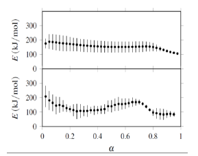 Confidence intervals (bars) for activation energies obtained from isoconversional analysis. Upper half: E obtained with integration. Lower half: E obtained with integration