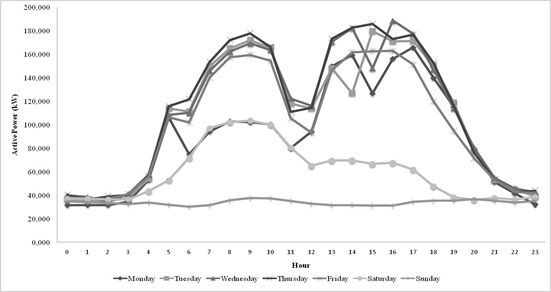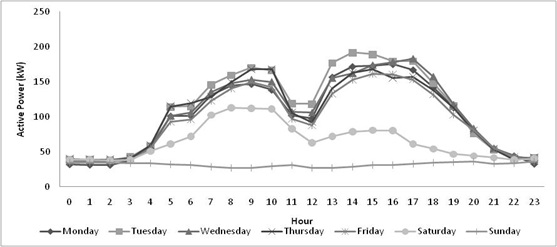 The daily measurements of active power obtained before and after the installation of the experimental PV solar system did not show significant changes, Figure 1 and Figure 2. During the academic period, the maximum energy consumption was 190 kW, but decreased to only 30 kW on vacation time. On Sundays, the academic activities do not affect the energy consumption during the operation of the PV solar system from 10 h to 15 h, except for an average decrease of 8 kW. A similar analysis from 10h to 12h suggested a 10-kW reduction. Conversely, the consumption of reactive power increased 7 % due to the operation of the PV solar system in comparison to the maximum value before the installation; if compared with the minimum value, the increase is 40 %.