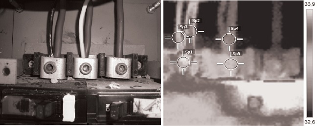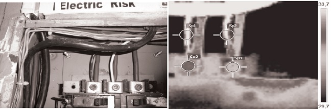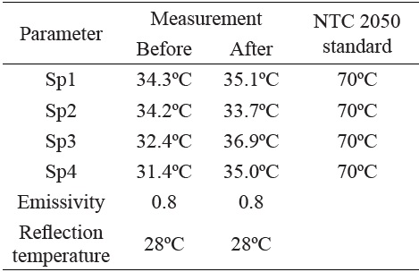 The heat transfer to the ambient air limits the conductor capacity, so the insulation temperature must be lower than the service value. Figures 3 and 4 show the temperature distribution before the operation of the PV solar system, respectively. The measurements followed the ANSI/IEEE C037.010-4.4.3 (21) standard for electrical installations. The FLIR-I5 thermographic camera has an emissivity of 0.8, thermal sensibility of 0.1º C and accuracy of ±2 %. The data analysis took into consideration the Colombian standard NTC 2050, which defines the ambient and system operation temperatures. The standard also contains the circuit dimensioning rules, but has no information about its operation temperature; this issue was found in the FLUKE operation manual, in which reference values are offered for transformers and low-voltage circuits.
