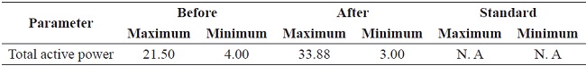 The total active power in the common connection point grew in 58 % due to the operation of the PV solar system, Table 10; this result corresponds to the increment in each phase. However, values of the total active power were not recorded during the operation of the solar system on Sundays because it generated all the energy cover the demand.