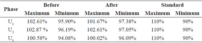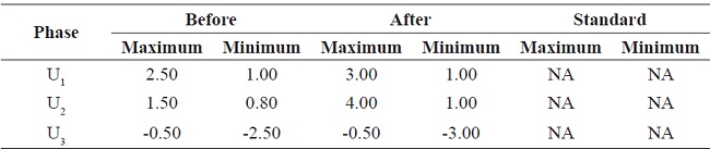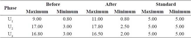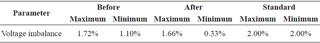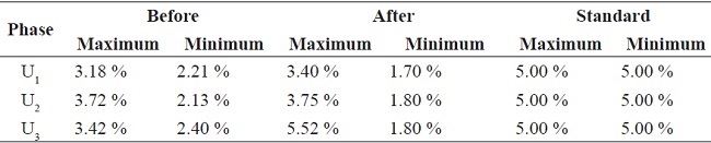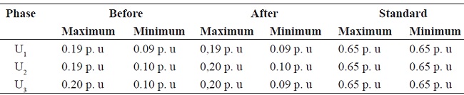 After the PV solar system startup, the voltage imbalance continued within the limits established by the NTC 5001 standard; however, the voltage imbalance reduced 3.5 to 70 % regarding the maximum and minimum values in Table 4. It is possible to obtain an increment in voltage imbalance as some authors suggested Von & Banerjee 10, but this was not the case.