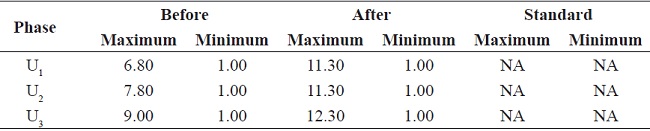 All the total harmonic distortions (THD) comply with the NTC 5001 standard; that is, lower than 5 %. In this case, the maximum value of 3.75 % was found on the phase U2. However, the THD values increased with the operation of the PV solar system as follows: 7 % in the phase U1, 0.8 % in the phase U2 and 3 % in the line U3, Table 7. Some authors explain this fact by including the effects of the electromagnetic emissions and the harmonics over the existing electrical structure 12. Another reference reported a similar increase between 0.7 %-2.5 % in an 8 kWp PV system 13.