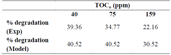 Theoretical and experimental degradation percentages are showed in Table 3. The maximum theoretical degradation percentage was 40%, with the lowest concentration of the contaminant. Solar photocatalysis performs correctly at low pollutant concentrations as demonstrated by experimental degradation percentages. An increase of initial concentration of albendazole, causes a decrease of degradation rate. Probably, what happens is that at high concentrations, pollutant molecules cover the catalyst surface and they block the electron-hole pair formation, which is important when starting the substance degradation.