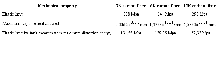 This analysis allows us to evaluate the safety factor to redesign and avoid malfunctions in the most desirable areas. That is, it provides the minimum and maximum values where the design and the material that have been chosen may falter, thus showing the results of stresses that exceed the elastic limit of the material and the stresses that are generated20. In this case, the mechanical parameters of maximum stresses, maximum displacement, and safety factors were analyzed. Figure 9 shows the analysis obtained, according to the best and least optimal design. The results showed that Design 3.0 in 12k carbon fiber has the best performance, achieving the support of up to 1.888.46 Newton. In contrast, Design 1.0 in 3k carbon fiber supports up to 1.358.08 Newton.