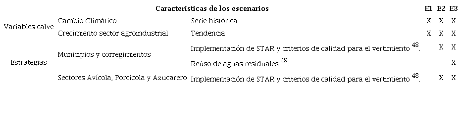Se formularon tres escenarios para la evaluación de la calidad y cantidad del recurso hídrico en los ríos de estudio. Los escenarios fueron construidos mediante la combinación de variables clave y dos estrategias de prevención control de contaminación como son la implementación de STAR y el reúso agrícola (Tabla 1).