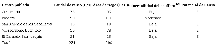 De acuerdo con lo anterior, se propone que al menos al año 2025, las cabeceras municipales de Candelaria y Pradera y los corregimientos de Villagorgona y San Antonio de los Caballeros, realizarán reúso de las aguas residuales tratadas. El caudal total estimado de reúso sería de 231 L/s y el área requerida para irrigación de 29 km2. Se excluye la cabecera municipal de Florida dado que ésta se encuentra en zona de alta vulnerabilidad del acuífero68. Es necesario tener en cuenta que, debido a la ausencia de STAR (al año 2015) y de información de calidad del vertimiento, no se consideraron los criterios de calidad establecidos para el reúso de la Resolución 1207 de 2014.