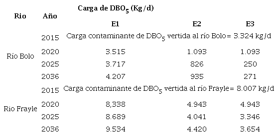 En la Tabla 5 se presentan las cargas vertidas de DBO5 para los diferentes escenarios y quinquenios propuestos para los ríos Bolo y Frayle. Para el río Frayle, al final del periodo de planificación (año 2036), en el escenario E2, que incluye la implementación de un STAR, se verterá una carga de DBO5 de 4,420 Kg/d, correspondiente a una reducción del 54% en relación con la carga producida y proyectada al mismo año (9,534 Kg/d). Para el escenario E3 que incluye el reúso de agua en el sector agrícola, la carga de DBO5 presentará una reducción del 62% de la carga producida.