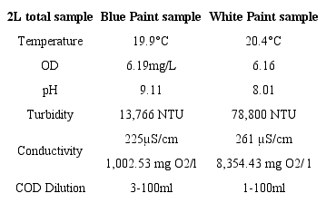 A representative 200 ml sample was extracted from the paint water sample which was subjected to electrocoagulation for the analysis of pre-treatment parameters, chemical oxygen demand (COD), dissolved oxygen (OD), turbidity, conductivity, pH and temperature.