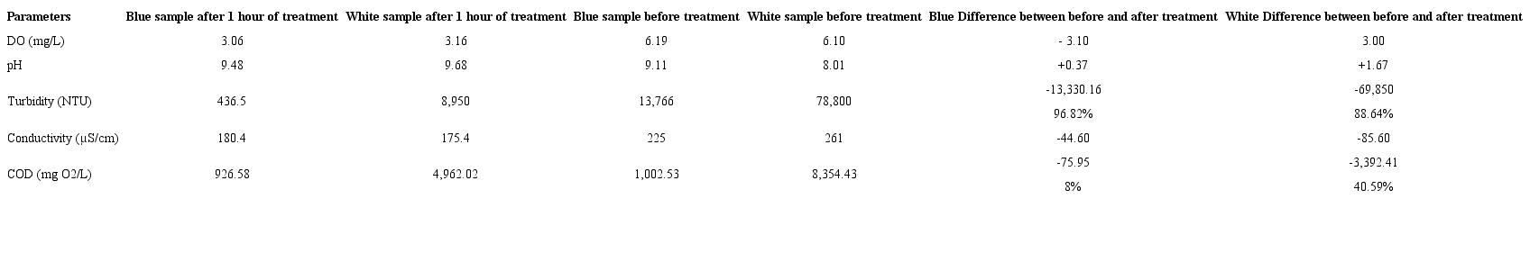 The results of the measurement of physicochemical parameters of pH, conductivity, temperature, turbidity, DO and COD, before and after the treatment with their efficiency in removal can be seen in Table 3.