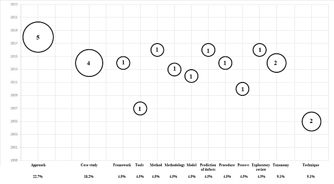 In the time window established and presented in Figure 1, since year 2000 onwards, there is an increasing interest in RBT, with research increasing from 2012 to the present. The percentage of studies according to the classification type per year is: (i) 22.7% corresponding to approaches: 2012 30, 2017 14, 2018 22, 2020 32,33; (ii) 18.2% corresponds to Case Study: 2000 21, 2010 29, 2014 2, 2016 12; (iii) 9.1% corresponds to Taxonomy: 2014 9, 2019 4; (iv) 9.1% corresponds to Techniques: 2005 26, 2018 28. (v) 40.9% corresponds to one article per year in Framework 2014 27, Tools 2007 31, Method 2016 8, Methodology 2013 25, Model 2012 13, Prediction of Defects 2016 23, Procedure 2014 7, Process 2010 10 and Exploratory Review 2016 24. Finally, in the years from 2001 to 2004, 2006, 2008, 2009, 2011, and 2015 no related studies are presented or there was no research and publication.