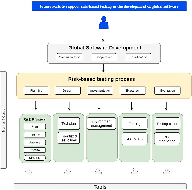 From the systematic mapping, we have identified a set of fundamental process elements such as roles, products, activities, and tools that allow identifying the contribution of each proposal, considering the software product risks and the general testing phases defined in the ISO 29119. In review and categorization of these elements, a first phase of the proposed framework development will be carried out that belongs to a process of RBT development for global software development teams, following the 3C (Communication, Coordination, and Cooperation) collaboration model 49, as this is a development approach that is currently used. Furthermore, this process will help companies to incorporate product risks and test cases in an agile and efficient way. The framework consists of the following elements: (i) Practices of Global software development at the level of communication, coordination, and cooperation; (ii) Risk-based testing process for global software development that includes the phases: planning, design, implementation, execution, and evaluation. In addition, establish a set of roles and input and output artifacts that allow monitoring and control over the software tests that are generated. Likewise, within the risk-based testing process, in the planning section is Product Risk Management, which includes the identification, analysis, prioritization and strategy of risks in the development of the software product; and (ii) Software tools that include a set of guides or techniques that help execute the activities of the testing process model and tests to carry out a series of activities and make the documentation that helps to use this proposed process. Figure 2 shows a preview of the framework composed of the following elements: risk process model, test process model, and global development of software and tools.
