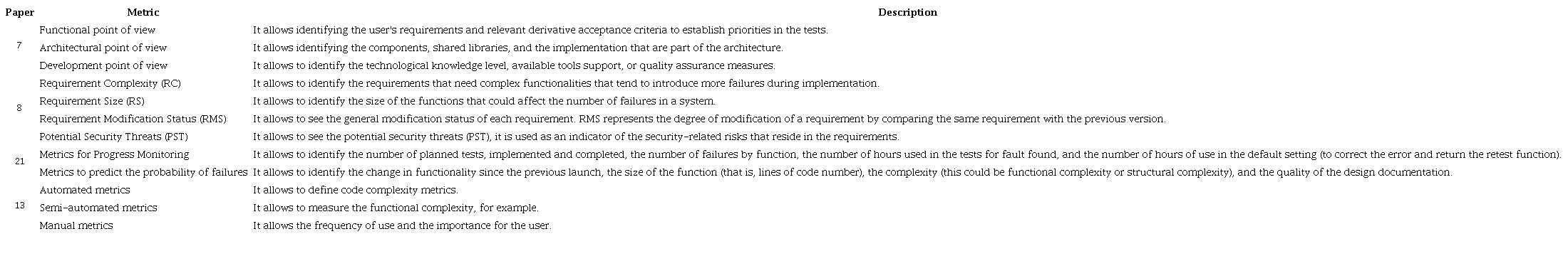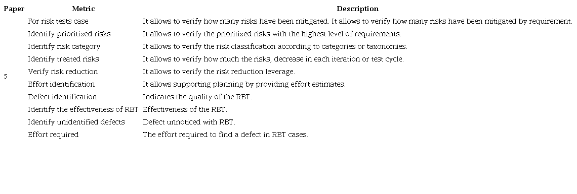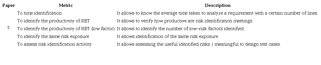 Table 9 describes the proposed metrics in general: 5, 7, 8,(21) , and(13) . In that sense, not all 23 primary papers analyzed propose metrics, only 23.8% of the proposals do it (5 papers). Table 10 shows the metrics for assessing the RBT process and Table 11 shows the Metrics for assessing RBT activities.