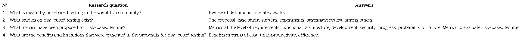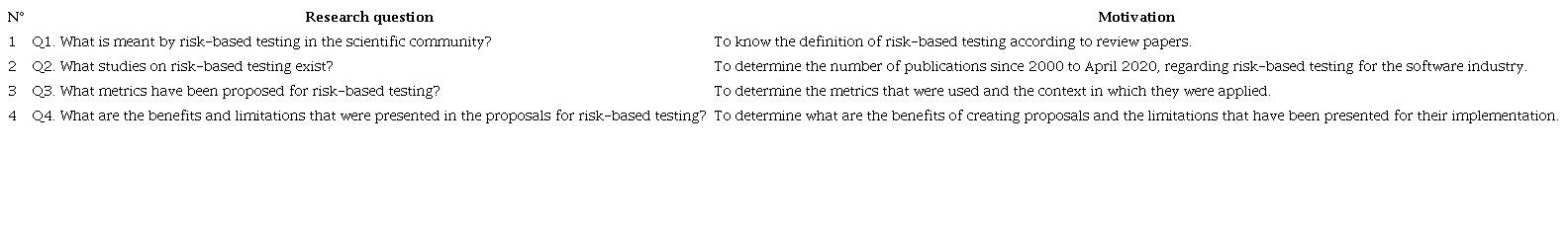 The main objective of this systematic mapping is based on identifying through the state of art publications related to RBT and their contribution to the software industry. Therefore, the research questions are described in Table 1.