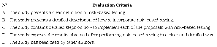 To obtain the best results from selected studies, quality studies will be measured to determine which are the most important and relevant RBT. To this end, a questionnaire was made considering the research questions mentioned previously with a score of three values -1 (No), 0 (Partially), and +1 (Yes). The questionnaire consists of the evaluation criteria presented in Table 2 and Table 3 presents the definition of each of the evaluation criteria defined to evaluate the primary studies in detail.