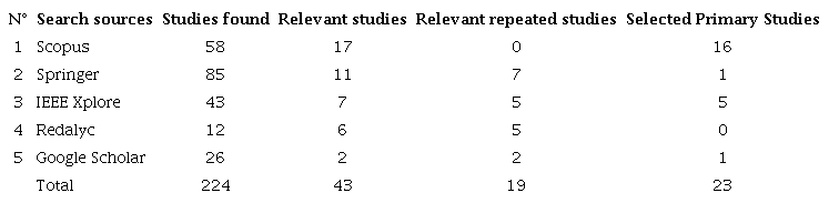 In the implementation stage, the application of the revision protocol defined in the previous stage was carried out. The number of iterations performed was two, one iteration for each established search source. Table 5 presents the total number of studies found, relevant studies, repeated ones, and primary studies found in the search sources: Scopus, Springer, IEE Xplore, Redalyc, and Google Scholar.