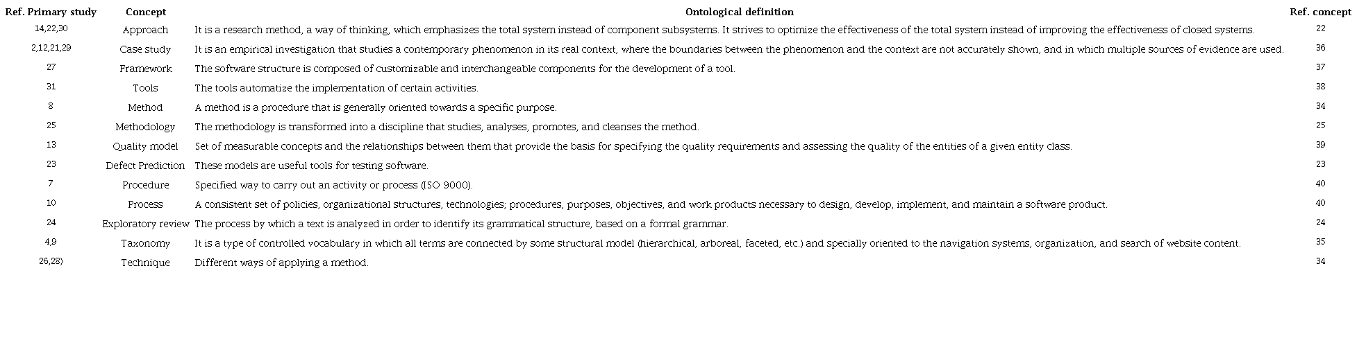 In order to give a better organization to the articles found on RBT, there is a use of concepts that allow the best identification of each one of them and to classify them for better understanding. Several of these concepts were obtained from ontological definitions described in 34,35 and others from the same revised article. In Table 7, the description of each classification type submitted is detailed, according to definitions presented by authors in ontologies. Likewise, a detailed description of each classification term meaning is presented.