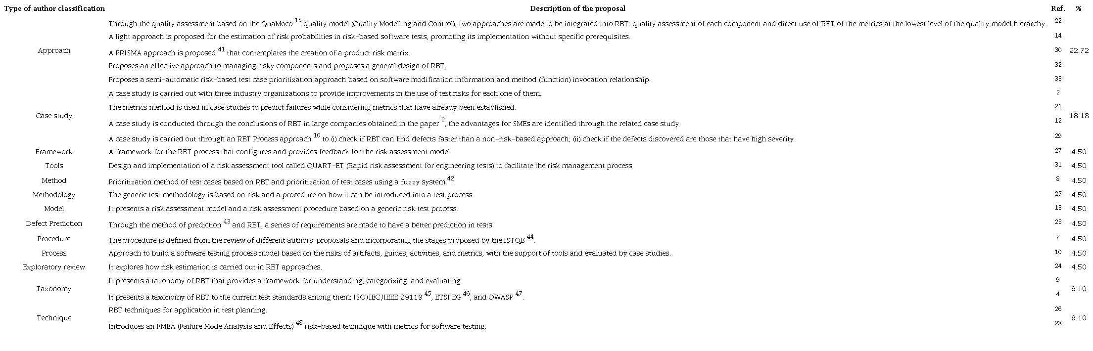 Table 8 shows the twenty types of studies found on RBT during systematic mapping. In addition, it can be seen that the approaches represent 23% of the studies, the techniques represent 9% of the studies, 18% corresponds to works where case studies were conducted, 9% corresponds to taxonomies and 45% corresponds to a study that contains: a procedure, a method, prediction of defects, exploratory review, a model, a methodology, process, and framework.